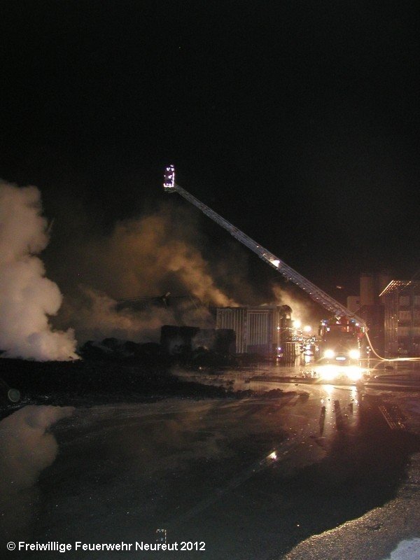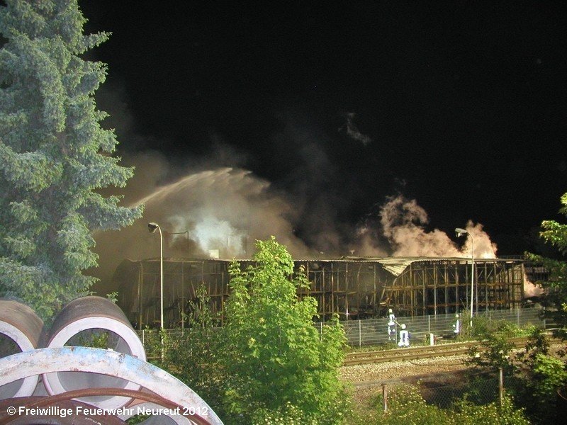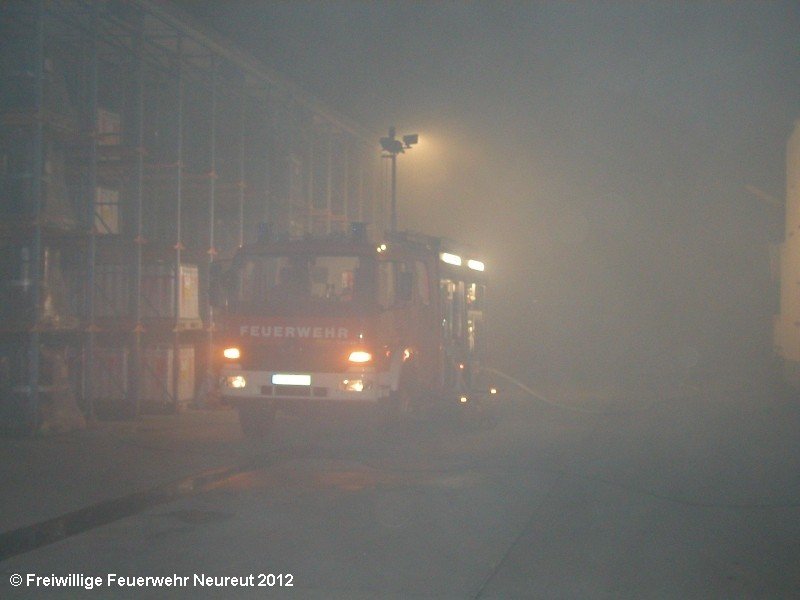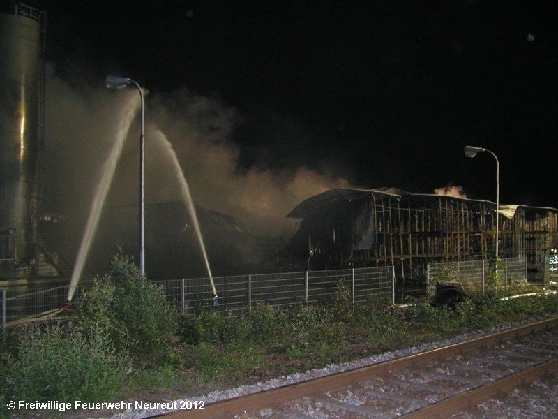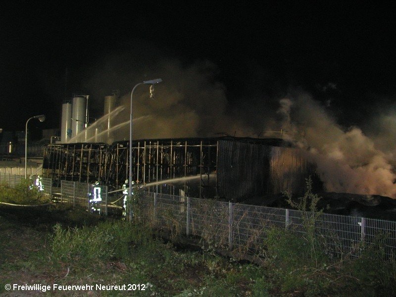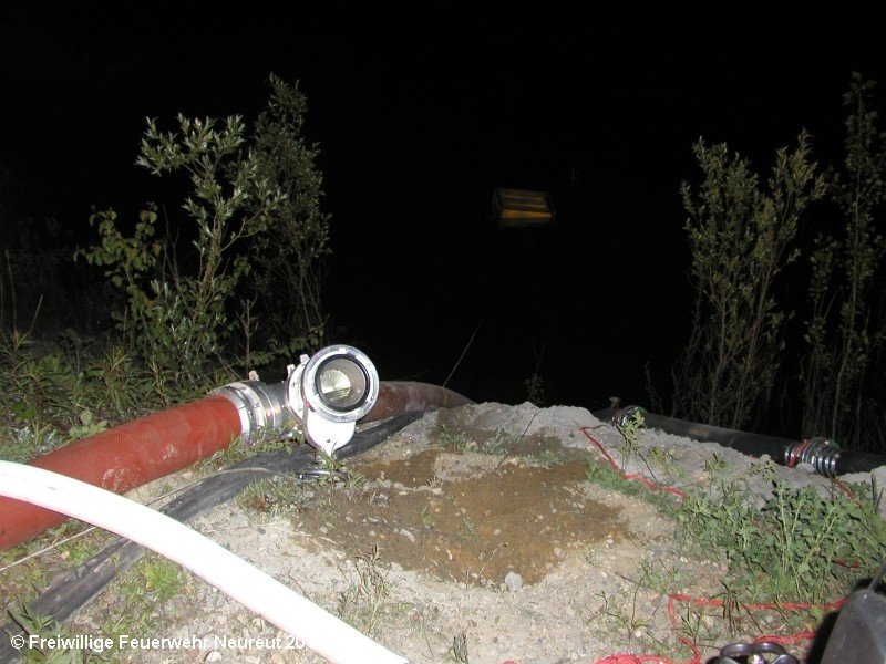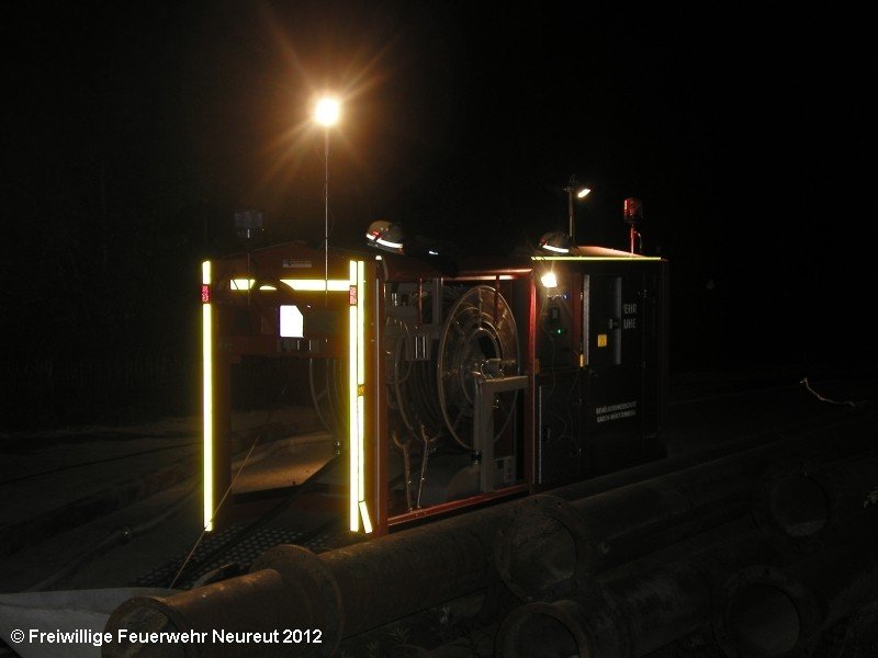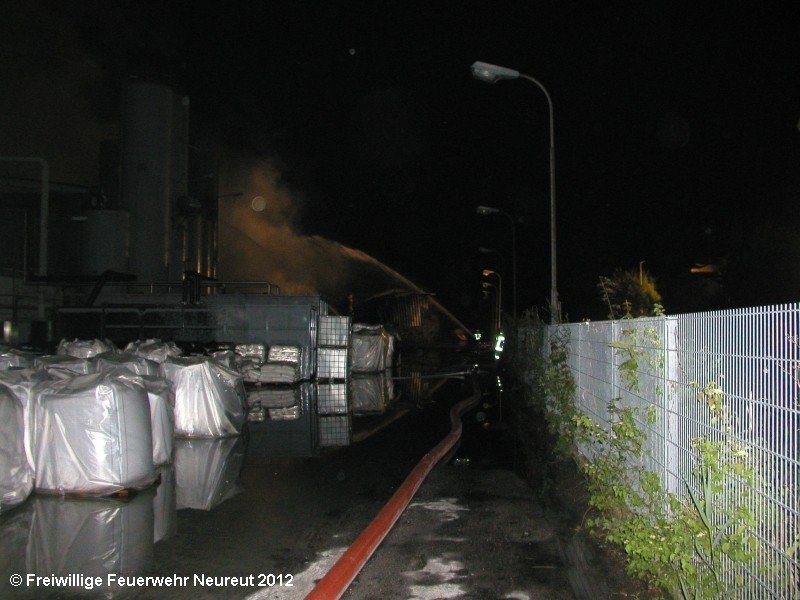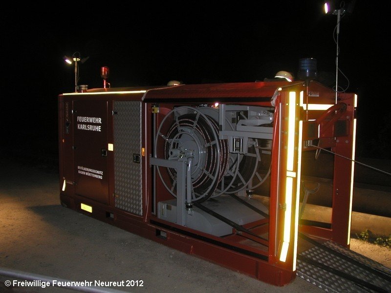 Zu einem Großeinsatz auf dem Gelände einer Baustofffabrik in Philippsburg-Rheinsheim wurde am Abend die Abt. Neureut alarmiert. Dort war eine Halle in Brand geraten, in der große Mengen Bitumen und Dachpappe gelagert waren. Gegen 19.20 wurde die Berufsfeuerwehr Karlsruhe mit dem Abrollbehälter Wasserförderung (HFS) der Feuerwehr Karlsruhe zur Sicherstellung einer Wasserversorgung aus einem nahe gelegenen Baggersee alarmiert. Durch die Kräfte der Berufsfeuerwehr wurde eine ca. 700 Meter lange Schlauchleitung verlegt, um mehrere Wasserwerfer einzuspeisen. Um 22.08 Uhr wurden die Kräfte aus Neureut zur Ablösung der Kameraden der Berufsfeuerwehr alarmiert. Mit dem MTW machten sich sieben Kameraden auf den Weg nach Rheinsheim. Dort eingetroffen, wurden diese durch den ebenfalls anwesenden Direktionsdienst eingewiesen und übernahmen anschließend den Betrieb des Wasserförderungssystems. Dieser wurde bis ca. 5.00 Uhr aufrecht erhalten, bis die Neureuter wieder durch Kräfte der Berufsfeuerwehr abgelöst wurden und die Rückfahrt antreten konnten.