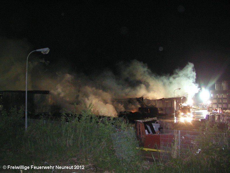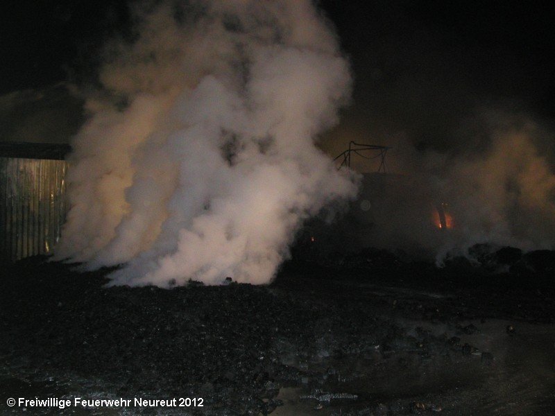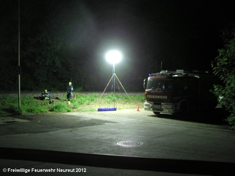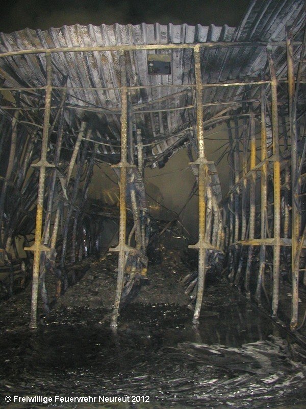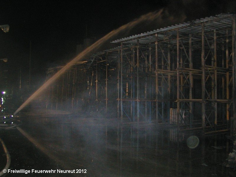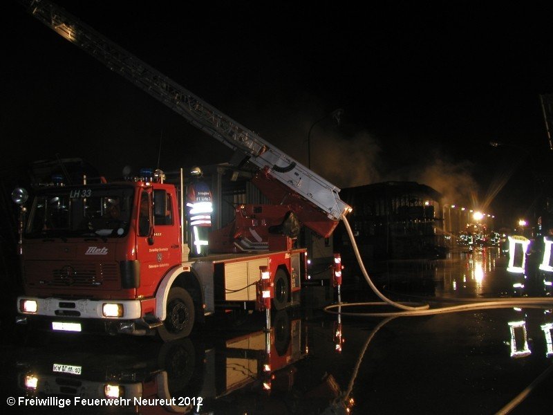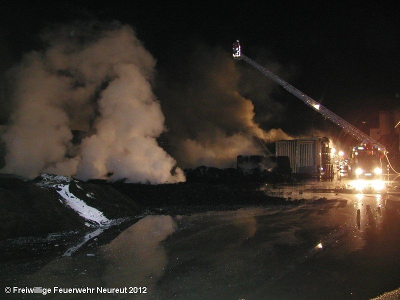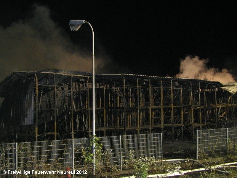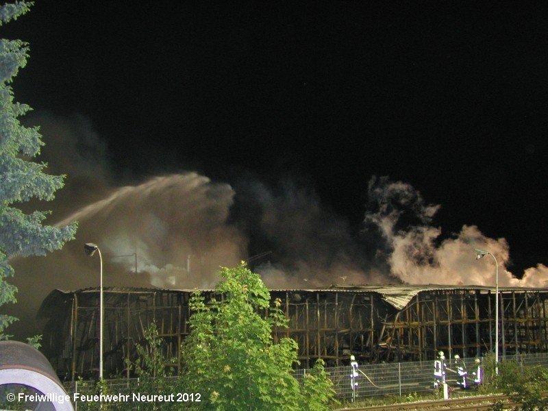 Zu einem Großeinsatz auf dem Gelände einer Baustofffabrik in Philippsburg-Rheinsheim wurde am Abend die Abt. Neureut alarmiert. Dort war eine Halle in Brand geraten, in der große Mengen Bitumen und Dachpappe gelagert waren. Gegen 19.20 wurde die Berufsfeuerwehr Karlsruhe mit dem Abrollbehälter Wasserförderung (HFS) der Feuerwehr Karlsruhe zur Sicherstellung einer Wasserversorgung aus einem nahe gelegenen Baggersee alarmiert. Durch die Kräfte der Berufsfeuerwehr wurde eine ca. 700 Meter lange Schlauchleitung verlegt, um mehrere Wasserwerfer einzuspeisen. Um 22.08 Uhr wurden die Kräfte aus Neureut zur Ablösung der Kameraden der Berufsfeuerwehr alarmiert. Mit dem MTW machten sich sieben Kameraden auf den Weg nach Rheinsheim. Dort eingetroffen, wurden diese durch den ebenfalls anwesenden Direktionsdienst eingewiesen und übernahmen anschließend den Betrieb des Wasserförderungssystems. Dieser wurde bis ca. 5.00 Uhr aufrecht erhalten, bis die Neureuter wieder durch Kräfte der Berufsfeuerwehr abgelöst wurden und die Rückfahrt antreten konnten.