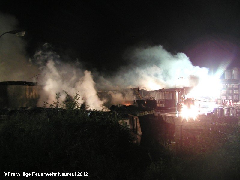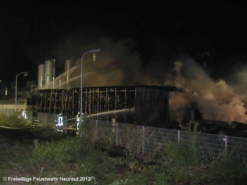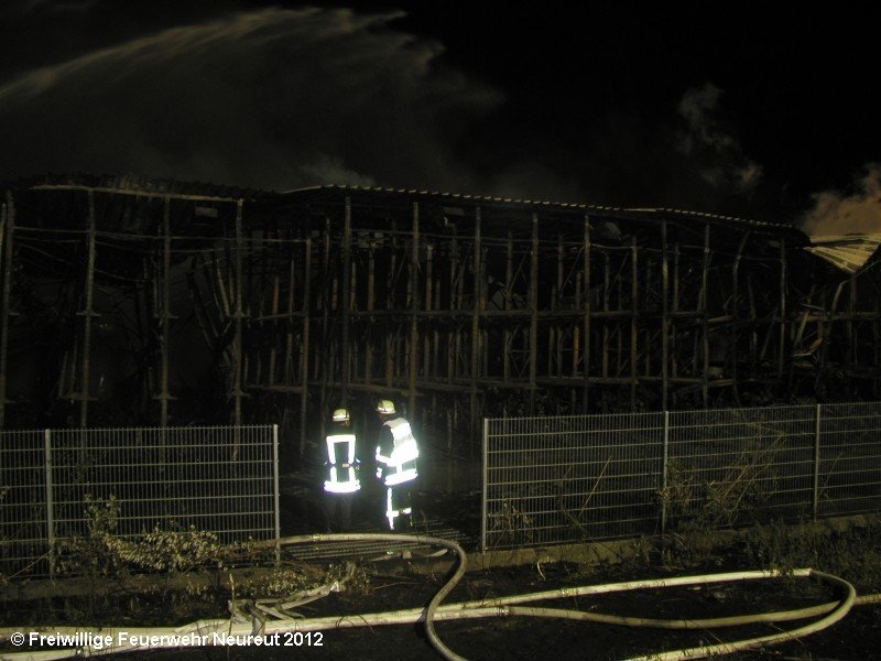 Zu einem Großeinsatz auf dem Gelände einer Baustofffabrik in Philippsburg-Rheinsheim wurde am Abend die Abt. Neureut alarmiert. Dort war eine Halle in Brand geraten, in der große Mengen Bitumen und Dachpappe gelagert waren. Gegen 19.20 wurde die Berufsfeuerwehr Karlsruhe mit dem Abrollbehälter Wasserförderung (HFS) der Feuerwehr Karlsruhe zur Sicherstellung einer Wasserversorgung aus einem nahe gelegenen Baggersee alarmiert. Durch die Kräfte der Berufsfeuerwehr wurde eine ca. 700 Meter lange Schlauchleitung verlegt, um mehrere Wasserwerfer einzuspeisen. Um 22.08 Uhr wurden die Kräfte aus Neureut zur Ablösung der Kameraden der Berufsfeuerwehr alarmiert. Mit dem MTW machten sich sieben Kameraden auf den Weg nach Rheinsheim. Dort eingetroffen, wurden diese durch den ebenfalls anwesenden Direktionsdienst eingewiesen und übernahmen anschließend den Betrieb des Wasserförderungssystems. Dieser wurde bis ca. 5.00 Uhr aufrecht erhalten, bis die Neureuter wieder durch Kräfte der Berufsfeuerwehr abgelöst wurden und die Rückfahrt antreten konnten.