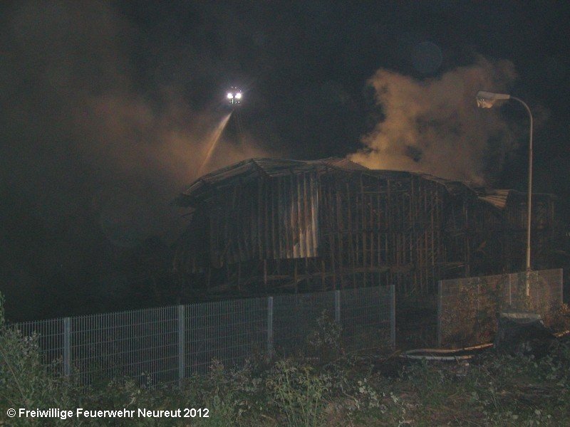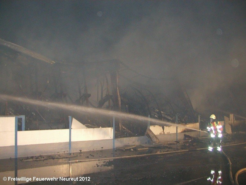 Zu einem Großeinsatz auf dem Gelände einer Baustofffabrik in Philippsburg-Rheinsheim wurde am Abend die Abt. Neureut alarmiert. Dort war eine Halle in Brand geraten, in der große Mengen Bitumen und Dachpappe gelagert waren. Gegen 19.20 wurde die Berufsfeuerwehr Karlsruhe mit dem Abrollbehälter Wasserförderung (HFS) der Feuerwehr Karlsruhe zur Sicherstellung einer Wasserversorgung aus einem nahe gelegenen Baggersee alarmiert. Durch die Kräfte der Berufsfeuerwehr wurde eine ca. 700 Meter lange Schlauchleitung verlegt, um mehrere Wasserwerfer einzuspeisen. Um 22.08 Uhr wurden die Kräfte aus Neureut zur Ablösung der Kameraden der Berufsfeuerwehr alarmiert. Mit dem MTW machten sich sieben Kameraden auf den Weg nach Rheinsheim. Dort eingetroffen, wurden diese durch den ebenfalls anwesenden Direktionsdienst eingewiesen und übernahmen anschließend den Betrieb des Wasserförderungssystems. Dieser wurde bis ca. 5.00 Uhr aufrecht erhalten, bis die Neureuter wieder durch Kräfte der Berufsfeuerwehr abgelöst wurden und die Rückfahrt antreten konnten.